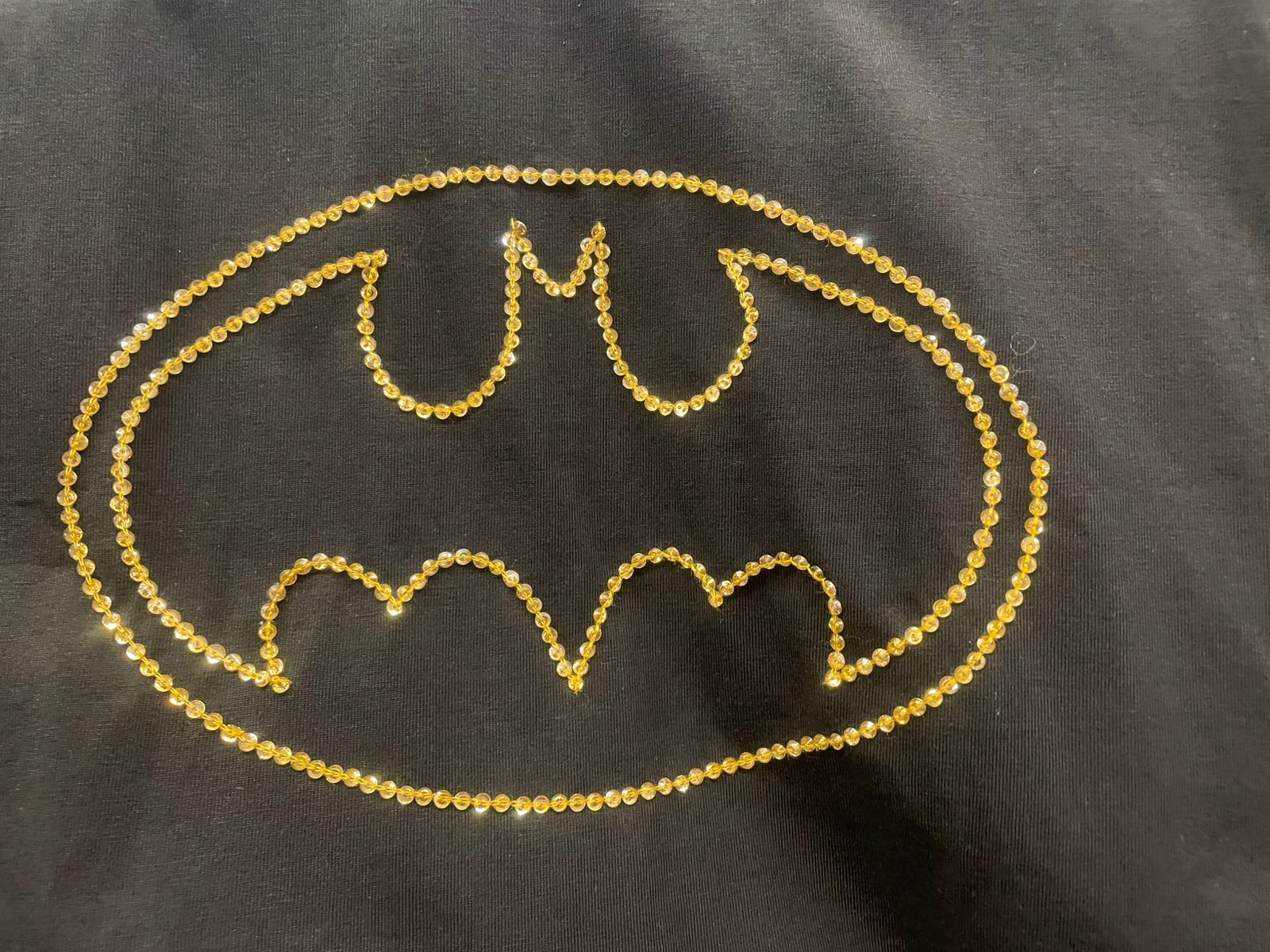 Elevate your casual wardrobe with this striking Batman t-shirt, meticulously crafted with traditional aari embroidery and adorned with shimmering golden stones. The intricate handwork transforms the iconic superhero design into a sophisticated statement piece, blending pop culture appeal with artisanal craftsmanship. Perfect for those who appreciate unique, embellished fashion that stands out from conventional graphic tees. The golden stone detailing catches light beautifully, adding dimension and luxury to your everyday style. Ideal for fans seeking elevated, conversation-starting wear.