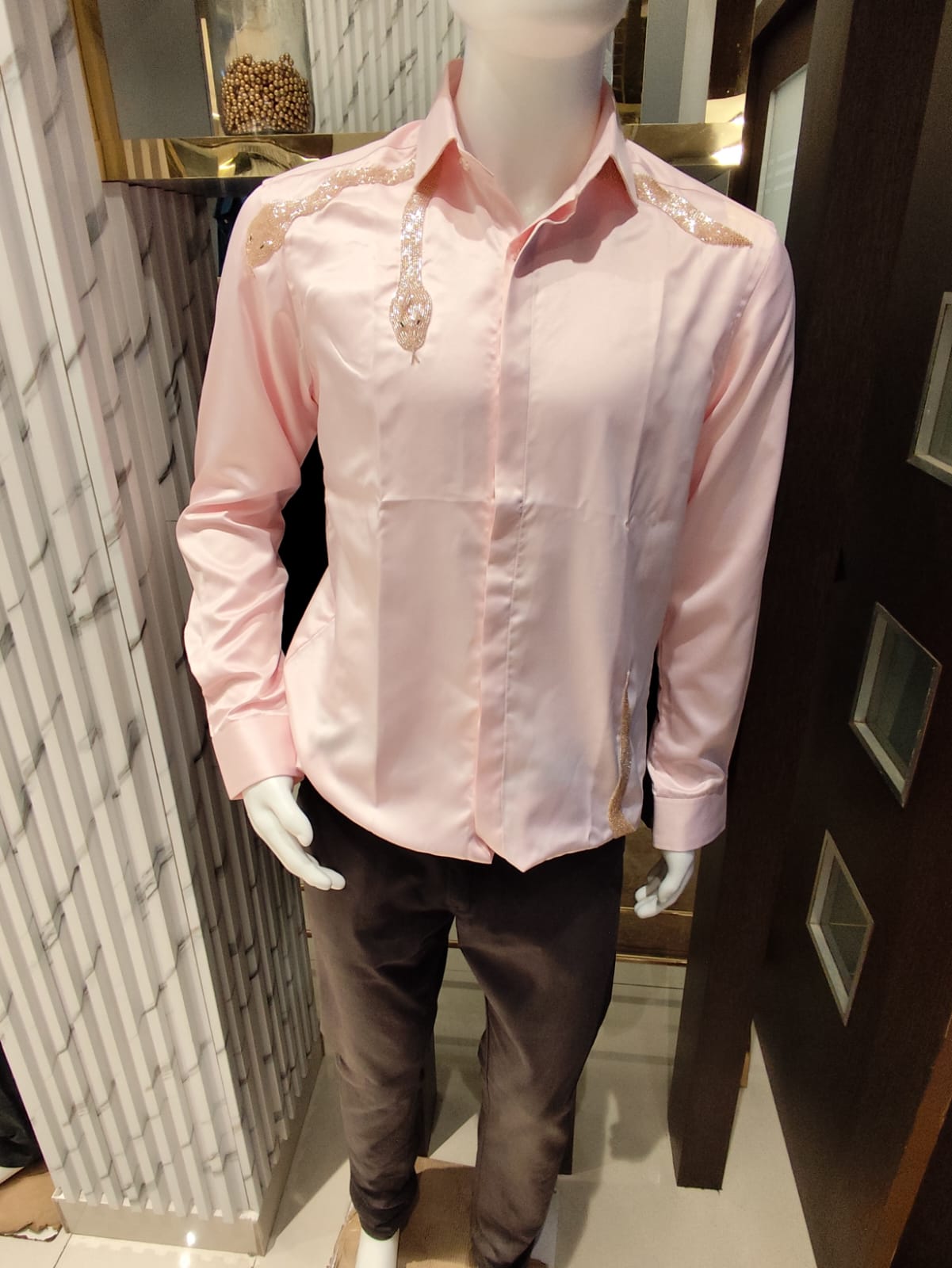 A striking designer shirt featuring an intricate snake motif rendered in bold, contemporary lines. The SNAKE DUREX design commands attention with its dynamic pattern, crafted for those who appreciate statement-making fashion. Premium fabric construction ensures comfort and durability through repeated wear. Perfect for elevating casual occasions or layering into sophisticated ensembles. The design reflects modern artistry while maintaining the refined aesthetic ANSH is known for—ideal for discerning customers seeking distinctive, conversation-starting pieces.